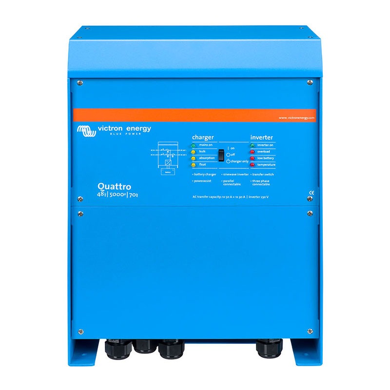 Quattro 48/5000/70-100/100 to wielofunkcyjny przemiennik energii, który łączy funkcje inwertera sinusoidalnego oraz zaawansowanej ładowarki akumulatorów. Dzięki technologii ładowania adaptacyjnego i szybkiemu przełącznikowi rezerwy, Quattro zapewnia niezawodne i bezprzerwowe zasilanie w każdym systemie energetycznym, jednocześnie chroniąc przed przeciążeniami i umożliwiając pracę z różnymi źródłami prądu przemiennego.