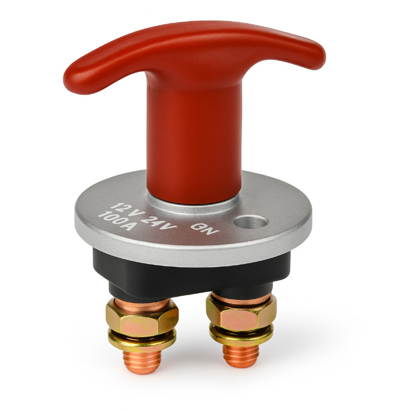 Wytrzymały rozłącznik główny do instalacji 12/24 V DC, przystosowany do pracy ciągłej z prądem do 250 A. Zapewnia szybkie i bezpieczne odcięcie zasilania w pojazdach, łodziach, kamperach oraz systemach off-grid, zwiększając bezpieczeństwo całej instalacji. Zaprojektowany do niskonapięciowych systemów zasilania w motoryzacji, zastosowaniach morskich oraz autonomicznych układach fotowoltaicznych, gdzie wymagana jest niezawodna separacja akumulatora. Może pełnić rolę głównego wyłącznika serwisowego lub elementu bezpieczeństwa w skrzynkach i szafach zasilających (np. Szafa FF01-6615-12BL V2 z termostatem), instalacjach PV off-grid, kamperach, łodziach oraz innych systemach, w których wymagane jest szybkie i pewne odłączenie akumulatora.